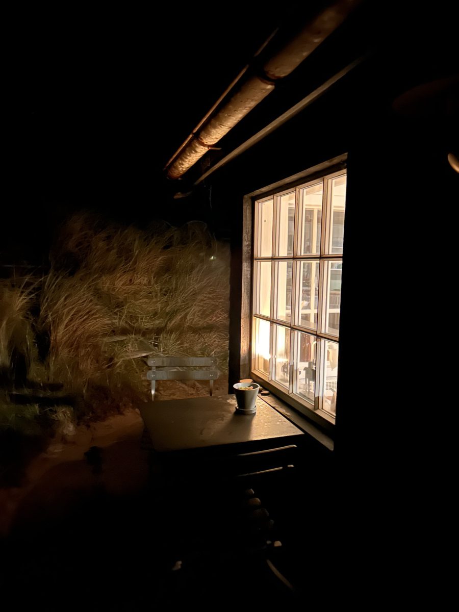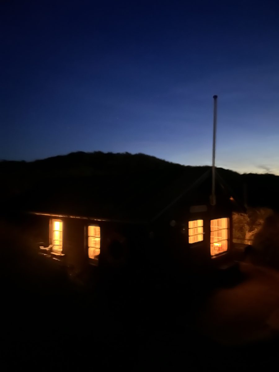 Das große Glück liegt für uns im Kleinen: Der große Esstisch aus Holz ist im Hauptraum das Zentrum. Daneben ein kuschliges Daybed, das man als Couch nutzen, in dem man auch wunderbar zu zweit schlafen kann (Größe Französisches Bett). In einem zweiten kleineren Zimmer gibt es zwei Stockbetten und als Stauraum einen kleinen Einbauschrank. Man kann sich also sogar mit zwei Kindern in jedem Fall gut verteilen. Es gibt keine Spülmaschine, einen Zwei-Plattenherd, ausreichend Teller in jeder Größe, wunderschöne Keramik und Holmegaard-Gläser. Das süße kleine Bad mit WC und Waschbecken ist rückseitig ans Haus angebaut und nur von außen zu erreichen. Die Dusche ist ebenso westseitig und blickgeschützt ans Haus angebracht, eine Außendusche mit herrlich warmen Wasser – man duscht komfortabel im größten Badezimmer der Welt: den Dünen Dänemarks. Das Häuschen verfügt in jedem Zimmer über elektrische Heizkörper und es ist kuschlig und herrlich gemütlich in den Räumen auch in Herbst und Winter, sehr gut isolierte Sprossenfenster über Eck lassen zu jeder Tageszeit viel Licht und Sonne ins Haus.